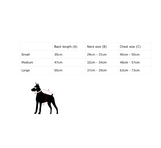 Sizing: We recommend using a soft measuring tape to measure your dogs’ back (A), neck (B) and chest (C). If your dog is between sizes, we suggest going up a size. If you’re still not sure of the best jacket size for your furry loved ones, get in touch by filling in our form. Please include your dog’s breed and if possible their measurements, so we can help advise you on the best size for your cute doggos.
